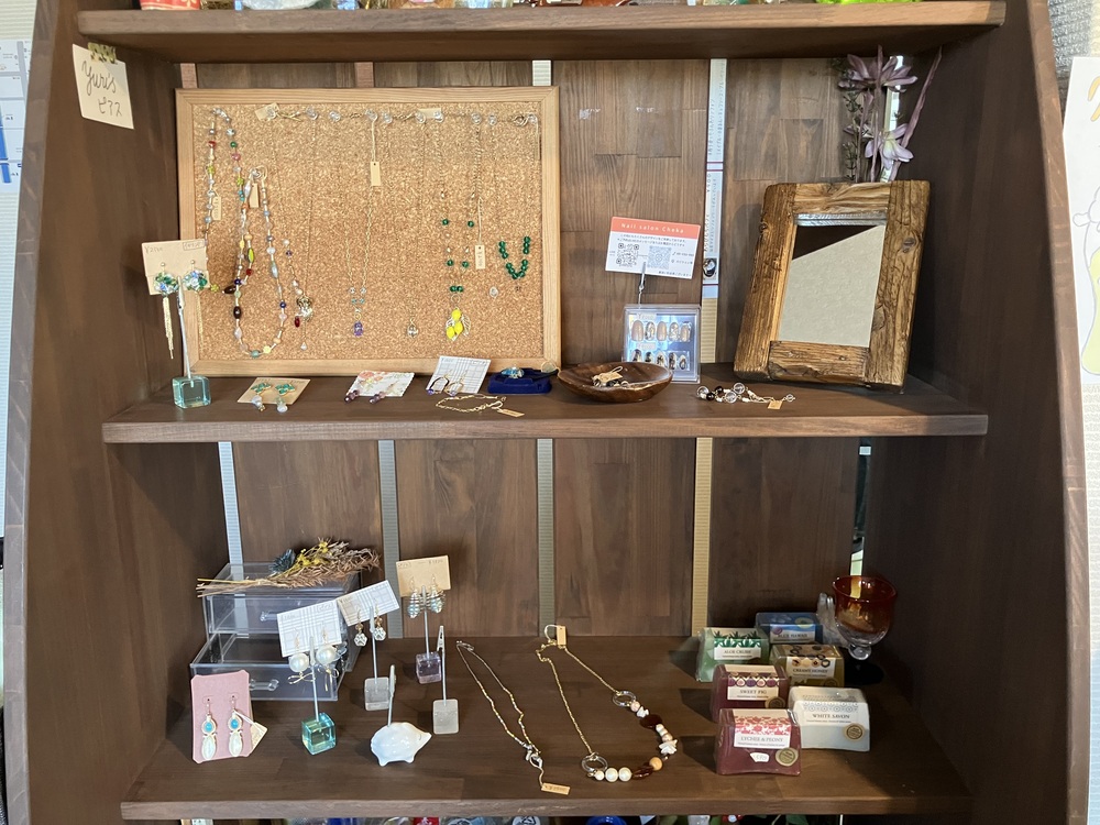 のどカフェには手作りのアクセサリーも。ホームメイドのあたたかさは、お店の雰囲気にもぴったり。