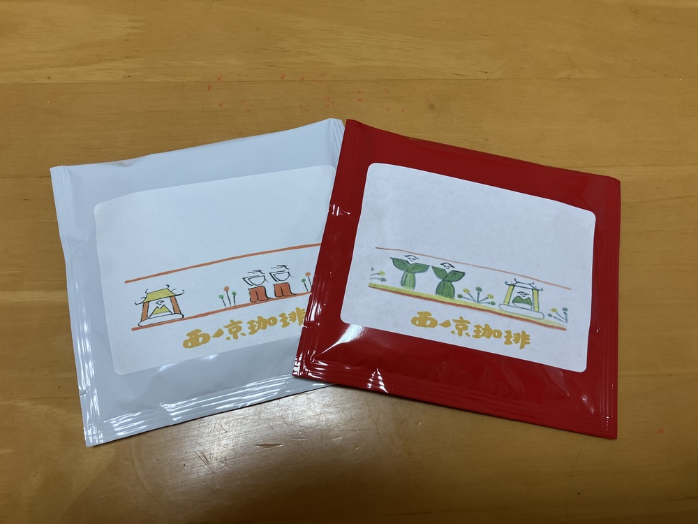 西ノ京珈琲のドリップコーヒーは、1つからでも購入できます。袋には奈良絵や毛筆の文字が。