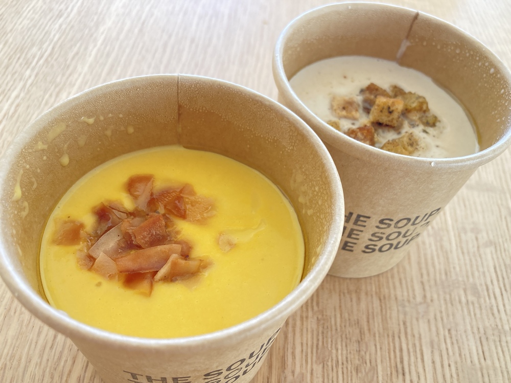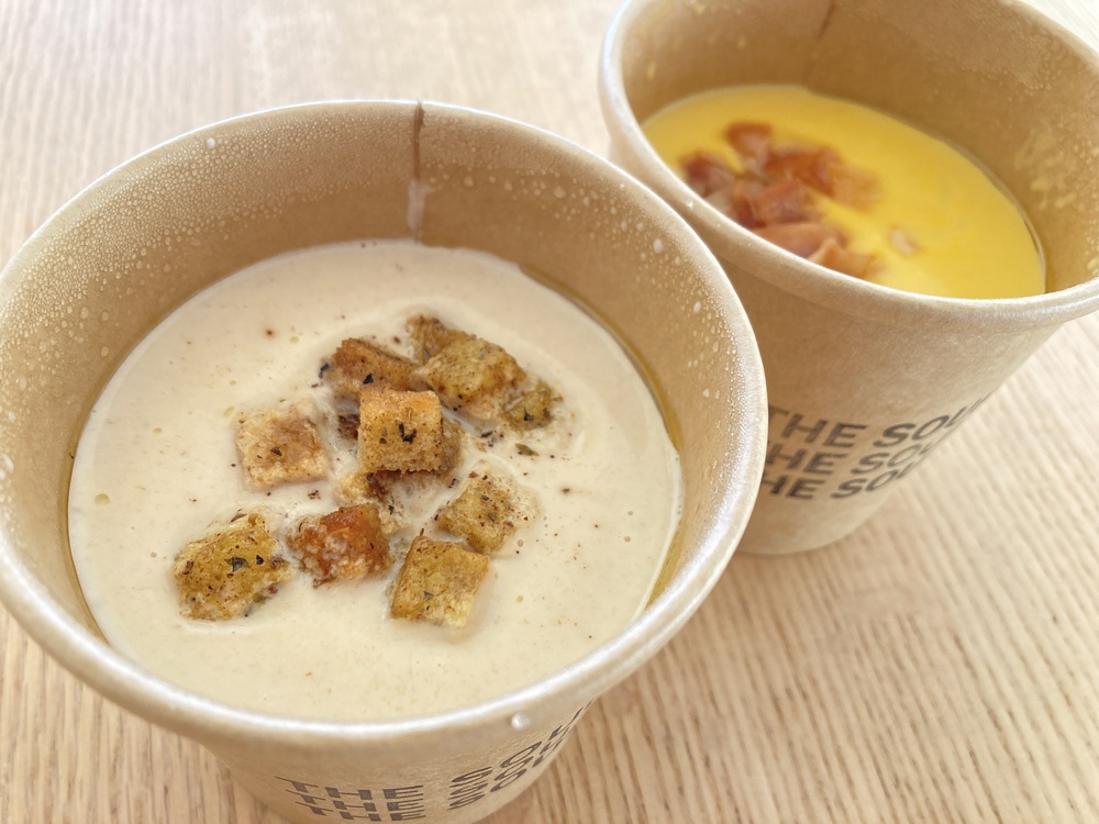 今回はその中から、季節のスープ「カリフラワーのスープ」と「キャロット&さつまいものポタージュ」の2種類を注文しました。