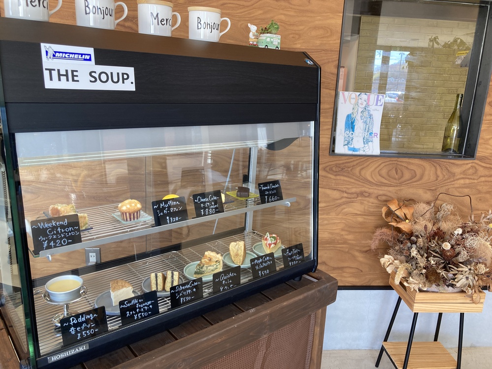 店内を見渡すと、スープ以外のメニューも充実しています。 ショーケースにはスイーツが並び、ランチだけでなくおやつタイムにも利用できそう。