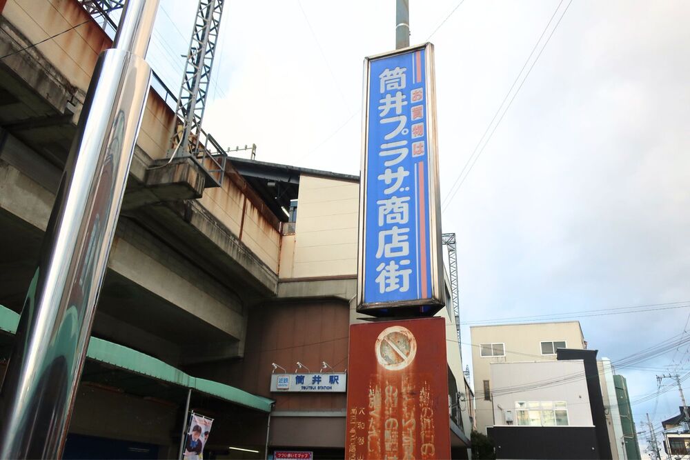 改札を出てすぐ目の前にある筒井プラザ商店街には、酒屋さんや食料品店などが立ち並んでいます。
