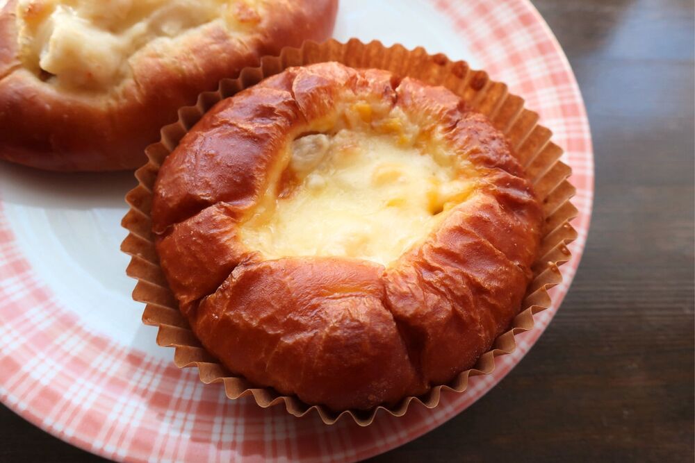 お惣菜パン一個目はコーングラタン。まるいパンの真ん中にグラタンが入っています。