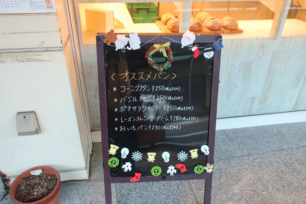 店先には、おすすめのパンが書かれた看板が置かれています。ラインナップを見ただけで、食欲がわいてきますね!