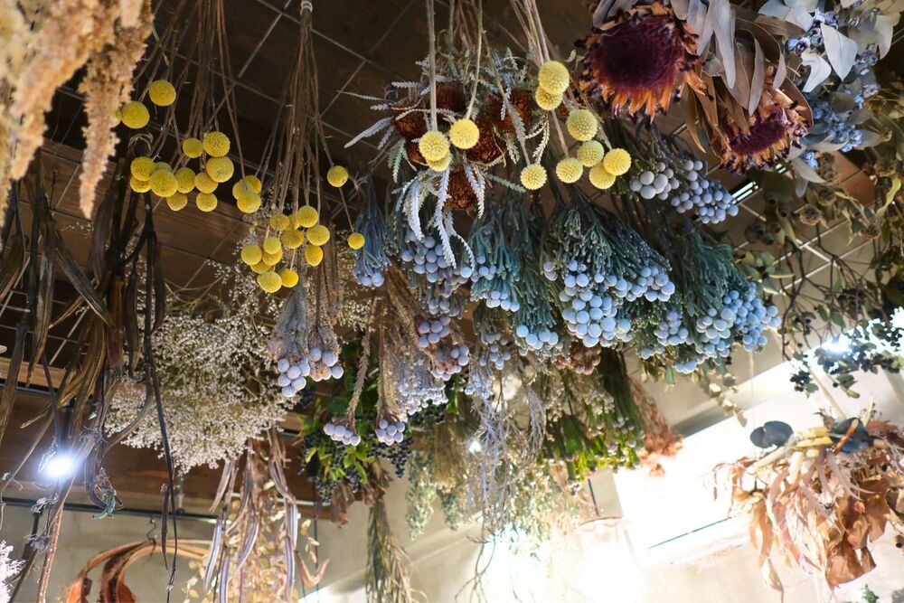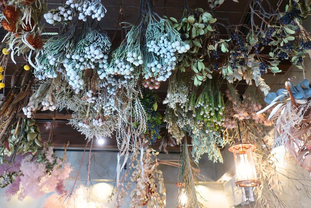 天井を見上げると、色とりどりのドライフラワーがつるされています!