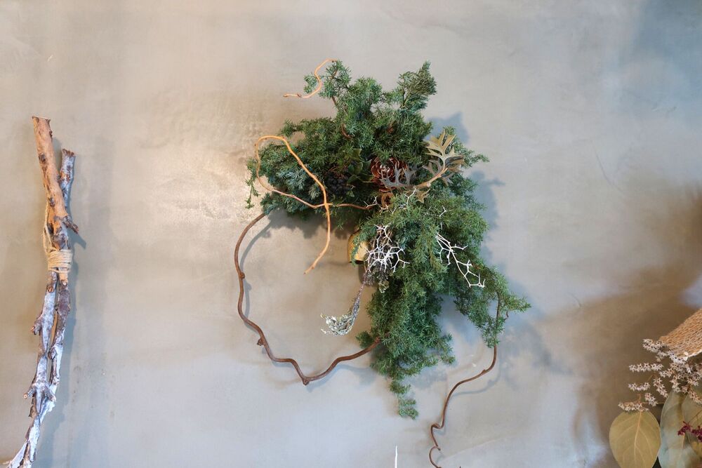 リースは、シックかつ美しい冬景色を彷彿とさせるデザイン。クリスマスを過ぎてもかざっておけるとのことで、好評だそうです。