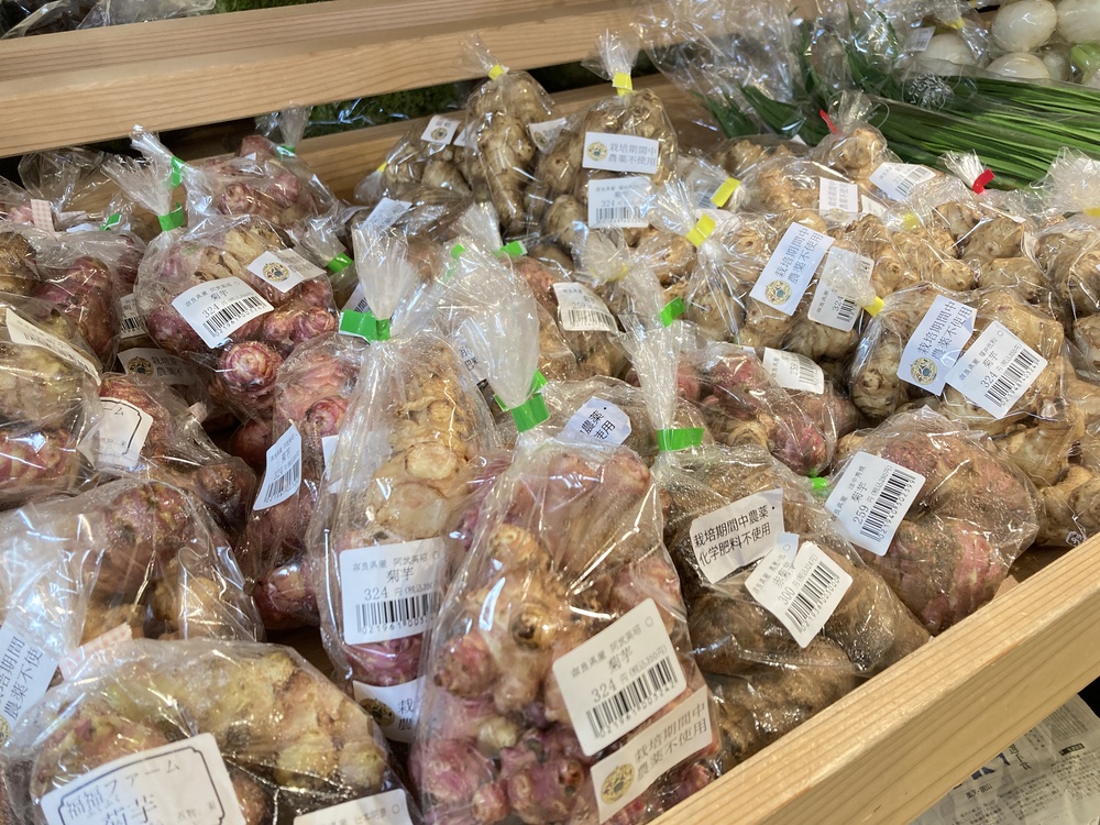 「菊芋」は数年前にこちらのお店で出会って以来、毎年購入しているお気に入り野菜のひとつ。「天然のインスリン」と呼ばれるイヌリンが豊富で、血糖値の上昇をゆるやかにする効果があるそうです。