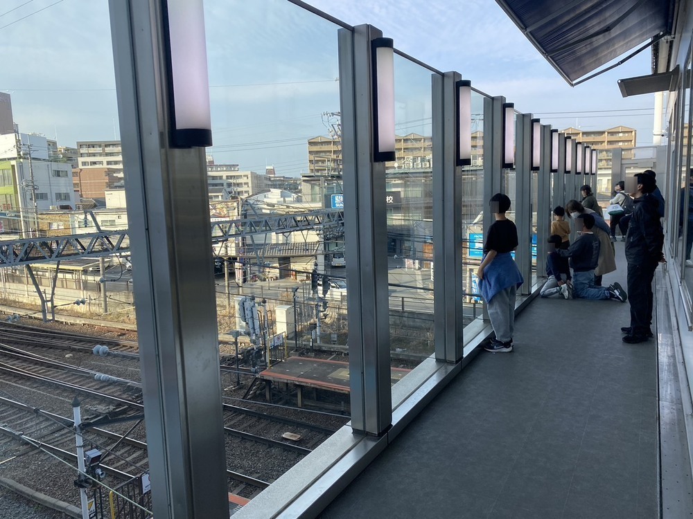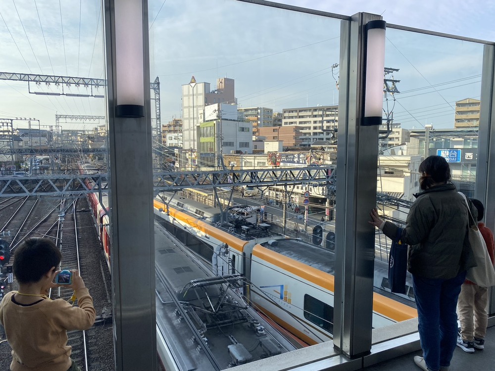 ここからは、近鉄の線路が四方に広がるダイナミックな風景を一望でき、電車が行き交う様子を間近に楽しめます。
