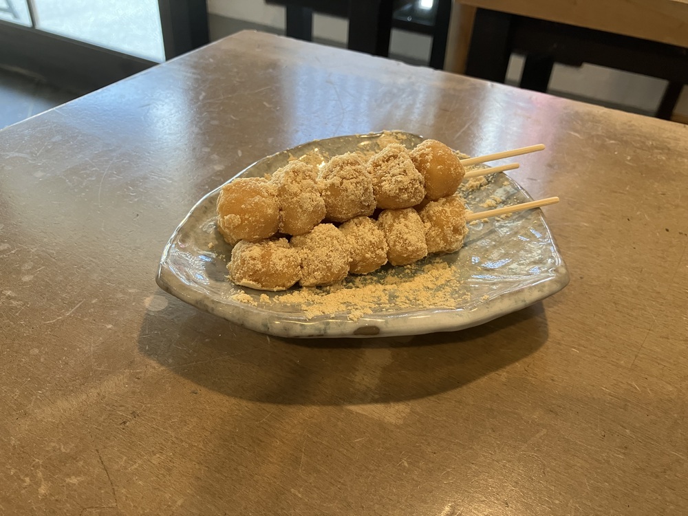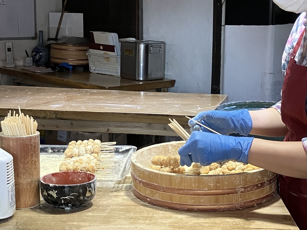 秘伝の蜜から引き上げただんごに、きなこをまぶして串に刺します。
